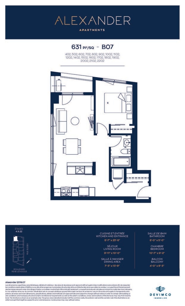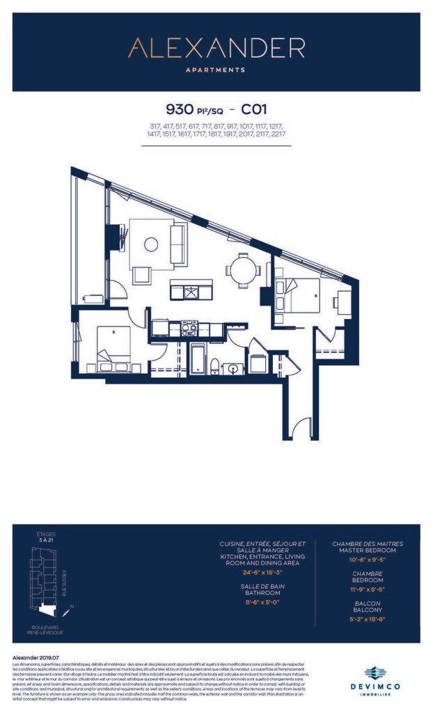 CURRENT PROMOTION: Up to 2 months of free rent* – certain conditions apply. Alexander Apartments is a new and modern rental project developed in two distinct phases, offering studios, 1-bedroom, 2-bedroom, 3-bedroom units, and penthouses. The project is located at the corner of René-Lévesque Boulevard and Sussex Street, near Atwater metro station. All-inclusive package: • Six appliances (fridge, stove, dishwasher, microwave, washer, and dryer) • High-speed internet • Electricity • Heating and air conditioning Indoor parking spaces ($260/month or $320/month for electric) and storage lockers ($40/month) are also available for rent. Building amenities: • Swimming pool • Terrace • Barbecue • Gym • Elevators • Video surveillance • Doorman • And much more Floor plans, descriptions, and photos are for reference only and may vary depending on the apartment type available.