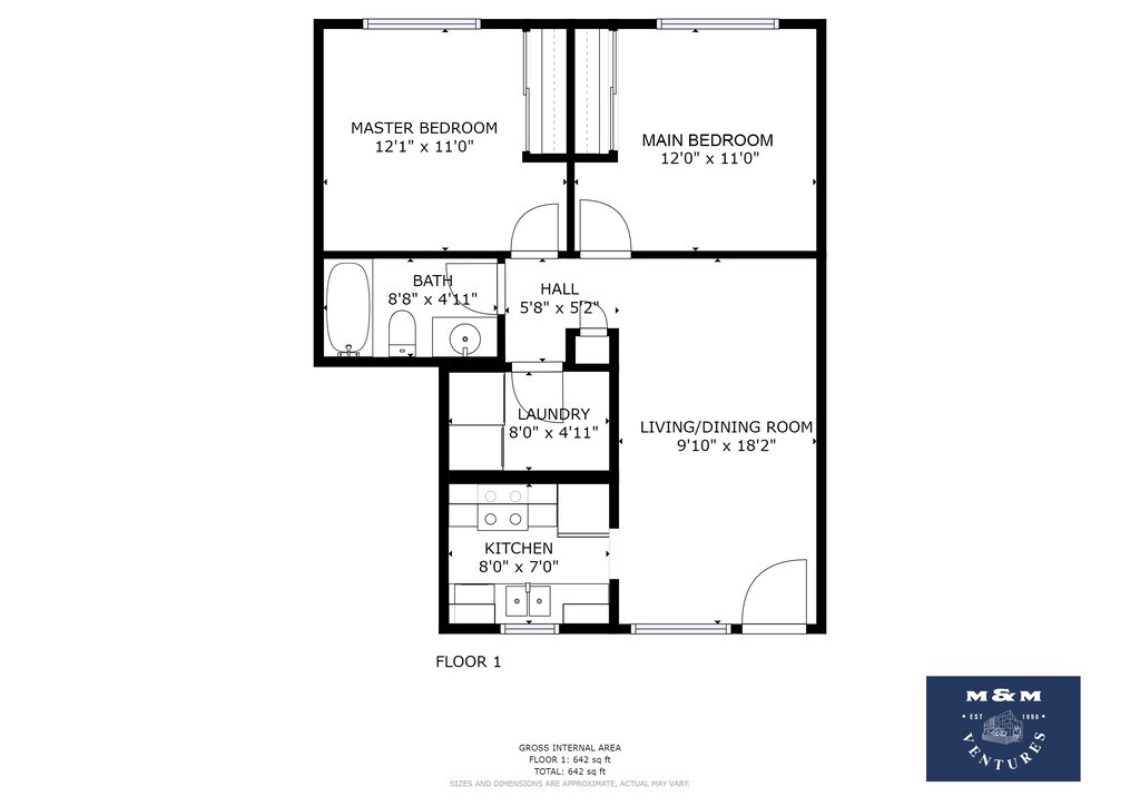 2BR,1BA,642 RSF - Floorplan 10