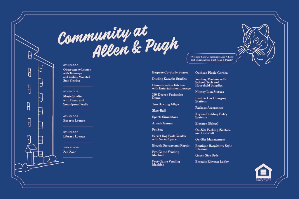 Allen & Pugh is off Allen Street with one-, two-, and our only three-bedroom apartments. This is where most of the fun happens. Pet spa, game room with bowling alley, demonstration kitchen, yoga studio, and bespoke study spaces. A social hub with space to recharge and create. Central HVAC, private bathrooms, and industrial chic finishes in every unit.