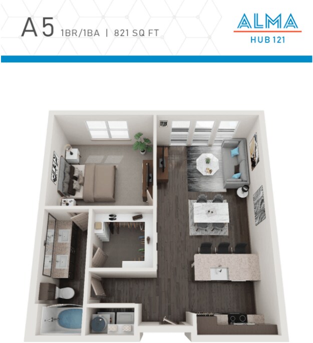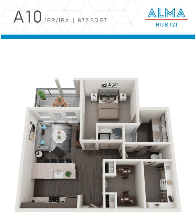 Alma Hub 121 offers 1 to 2 Bedroom apartments starting from $1,208 and having 568–1,403 sq ft. Here is the current pricing and availability: