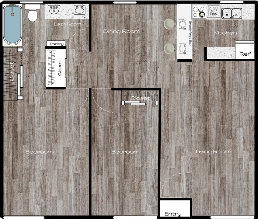 2 Beds, 1 Bath, 850 sq ftAvailable NowModel Gallery