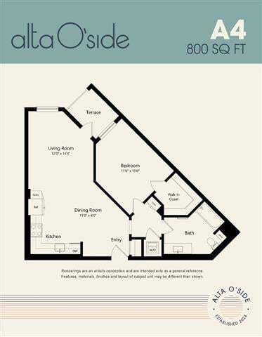 Apartment Model: A4From $2,9421 Bedroom, 1 Bath, 800 sq ftAvailable NowFloor plans are artist's rendering. All dimensions are approximate. Actual product and specifications may vary in dimension or detail. Not all features are available in every rental home. Prices and availability are subject to change. Base rent is based on monthly frequency. Additional fees may apply, such as but not limited to package delivery, trash, water, amenities, etc. Deposits vary. Please see a representative for details.
