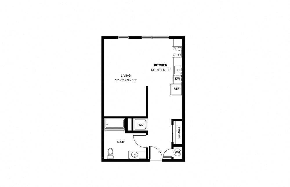 Apartment Model: 01D$1,593Studio, 1 Bath, 588 sq ftAvailable NowFloor plans are artist's rendering. All dimensions are approximate. Actual product and specifications may vary in dimension or detail. Not all features are available in every rental home. Prices and availability are subject to change. Base rent is based on monthly frequency. Additional fees may apply, such as but not limited to package delivery, trash, water, amenities, etc. Deposits vary. Please see a representative for details.