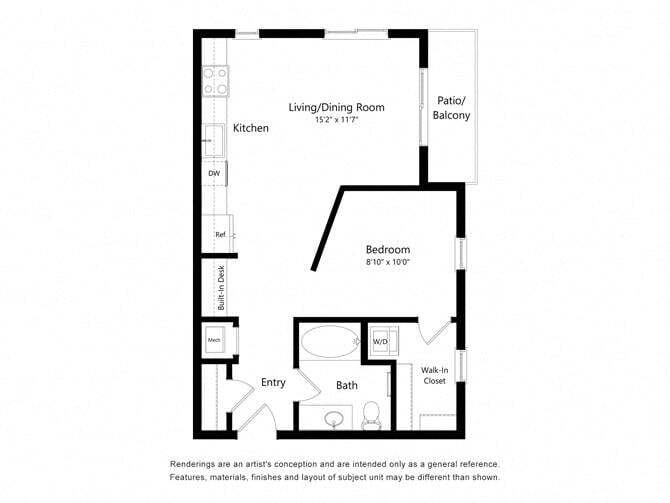Apartment Model: S1From $1,499Studio, 1 Bath, 642 sq ftAvailable NowFloor plans are artist's rendering. All dimensions are approximate. Actual product and specifications may vary in dimension or detail. Not all features are available in every rental home. Prices and availability are subject to change. Base rent is based on monthly frequency. Additional fees may apply, such as but not limited to package delivery, trash, water, amenities, etc. Deposits vary. Please see a representative for details.