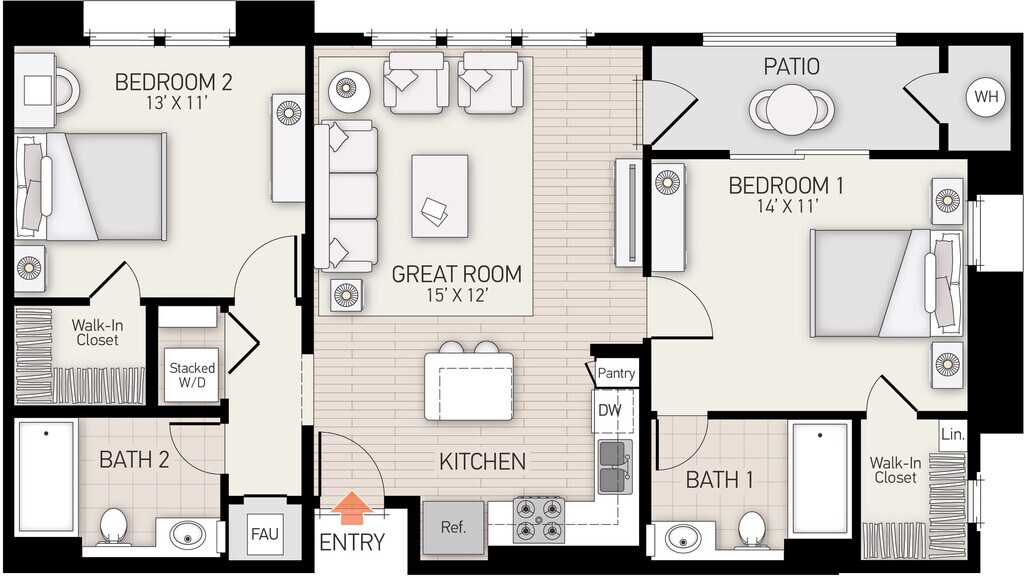 Apartment Model: Plan E1From $2,9001 Bedroom, 1 Bath, 730 sq ftAvailable Now![]()