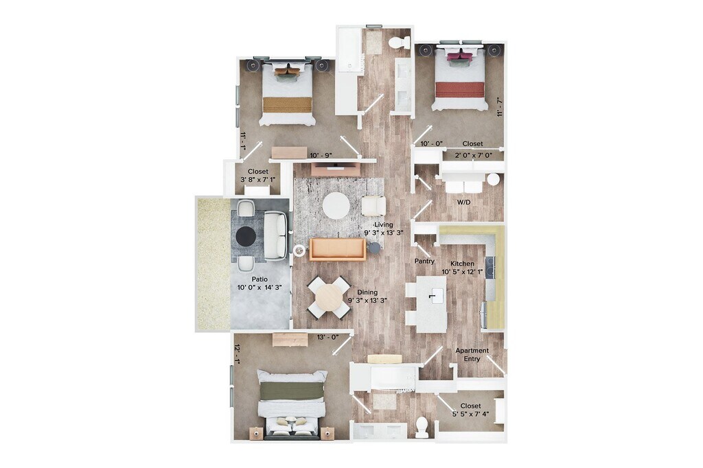 - 3 Bedrooms- Zinc- $2,3503 Beds, 2 Baths, 1417 sq ftAvailable Nov 29- Model Gallery- Floorplans- Availability Details- Price - Availability Date - Unit - Sq Ft - $2,350 - November 29, 2025 - 1203 - 1417 - Model Amenities and Features- Features- Air Conditioning