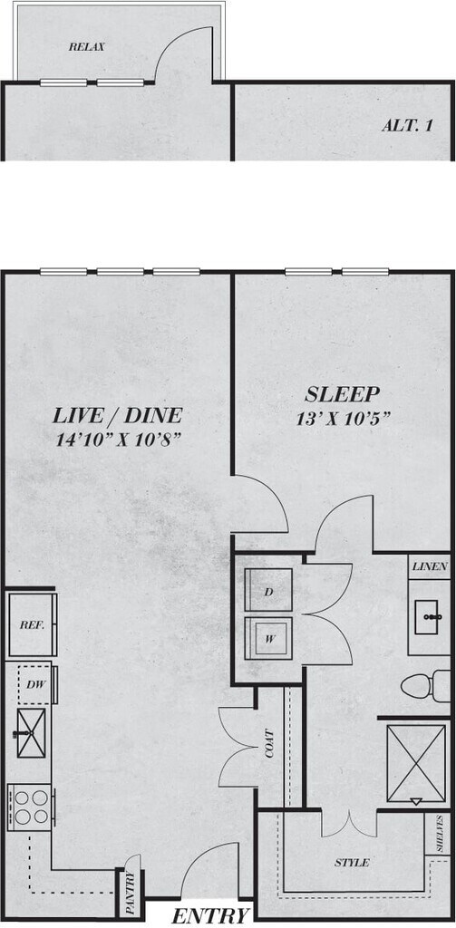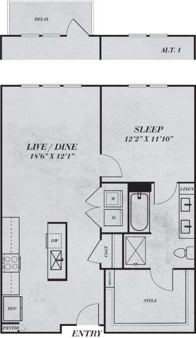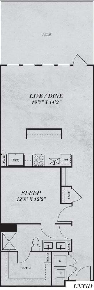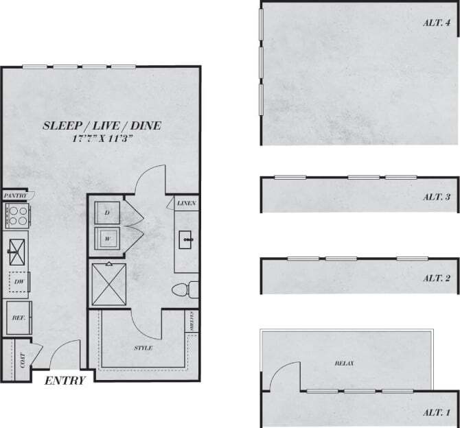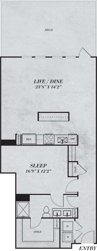 Apartment Model: S1From $1,471Studio, 1 Bath, 534 sq ftAvailable NowFloor plans are artist's rendering. All dimensions are approximate. Actual product and specifications may vary in dimension or detail. Not all features are available in every rental home. Prices and availability are subject to change. Base rent is based on monthly frequency. Additional fees may apply, such as but not limited to package delivery, trash, water, amenities, etc. Deposits vary. Please see a representative for details.
