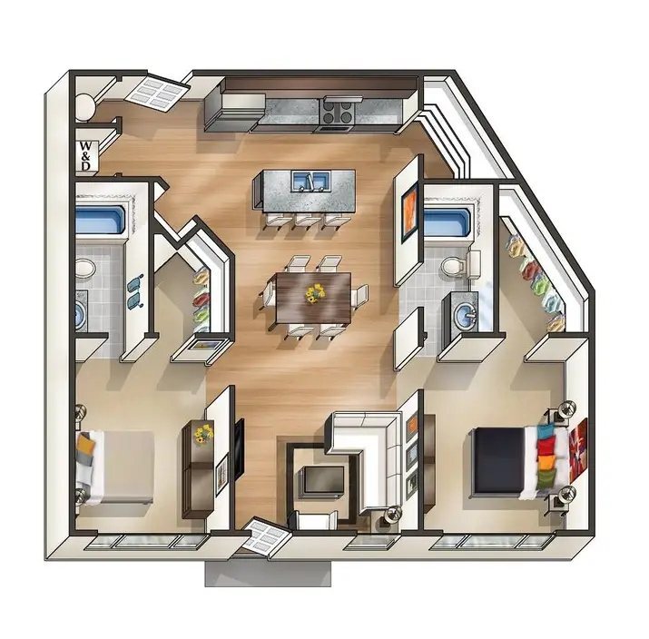 Apartment Model: 2 bedroomFrom $2,0502 Bedroom, 2 Bath, 1100 sq ftAvailable NowFloorplansPhotos![]()