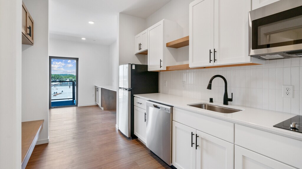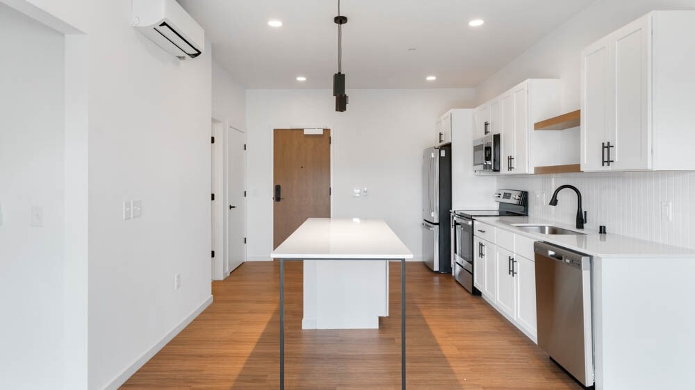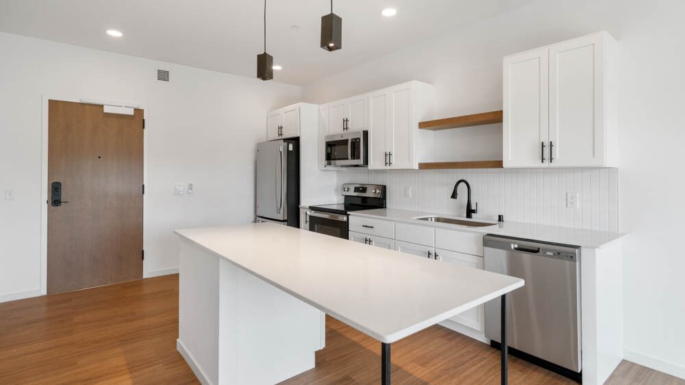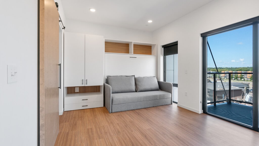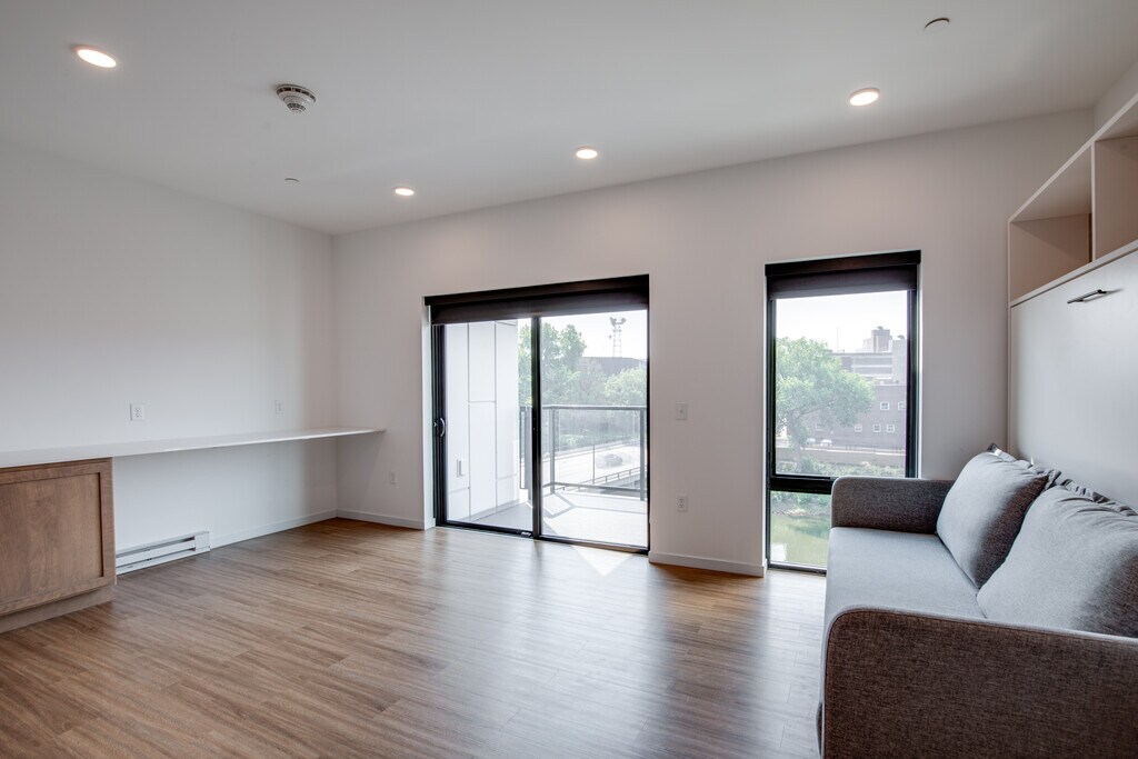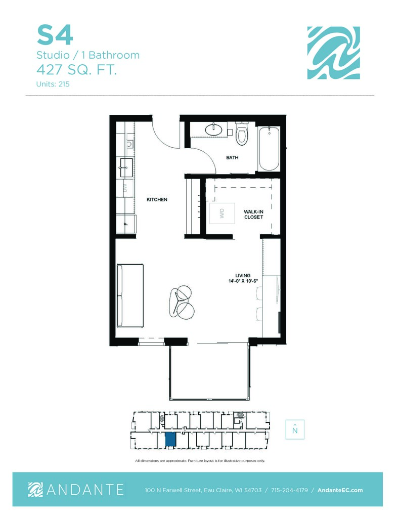 This is a Studio unit located in Andante, a 5-story mixed-use development located at 100 N. Farwell Street, in the heart of downtown Eau Claire. The project includes 76 residential units, including furnished studios, one-bedroom units, and two-bedroom units. The first floor of the building includes over 8,000 leasable square feet of commercial space.