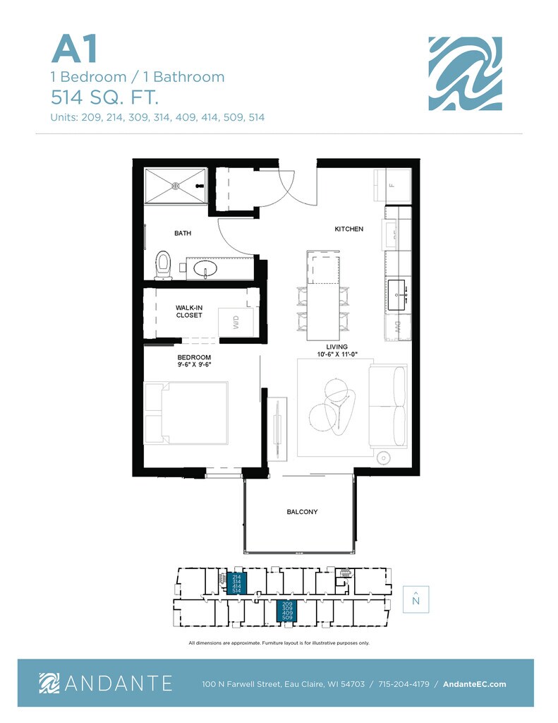 Andante is a 5-story mixed-use development located at 100 N. Farwell Street, in the heart of downtown Eau Claire. The project includes 76 residential units, including furnished studios, one-bedroom units, and two-bedroom units. The first floor of the building includes over 8,000 leasable square feet of commercial space. Live the way you've always wanted without compromising style or quality. Andante is a musical term meaning “a moderately paced walking tempo”. Our apartment residences and community features are designed with that in mind. Located downtown directly on the Chippewa River State Trail, residents are walking distance from many community amenities such as the Farmer's Market, Pablo Center at the Confluence, local restaurants and shopping, and more. Now you really can have it all . . . lifestyle included.