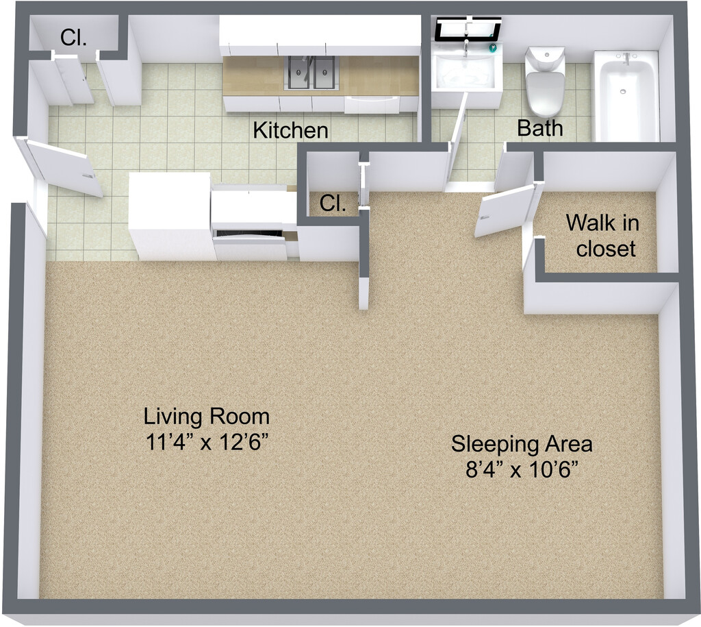 Studio, 1 Bath, 600 sq ftAvailable NowModel Gallery