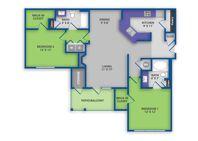 2 Beds, 2 Baths, 1243 sq ftAvailable NowModel Gallery