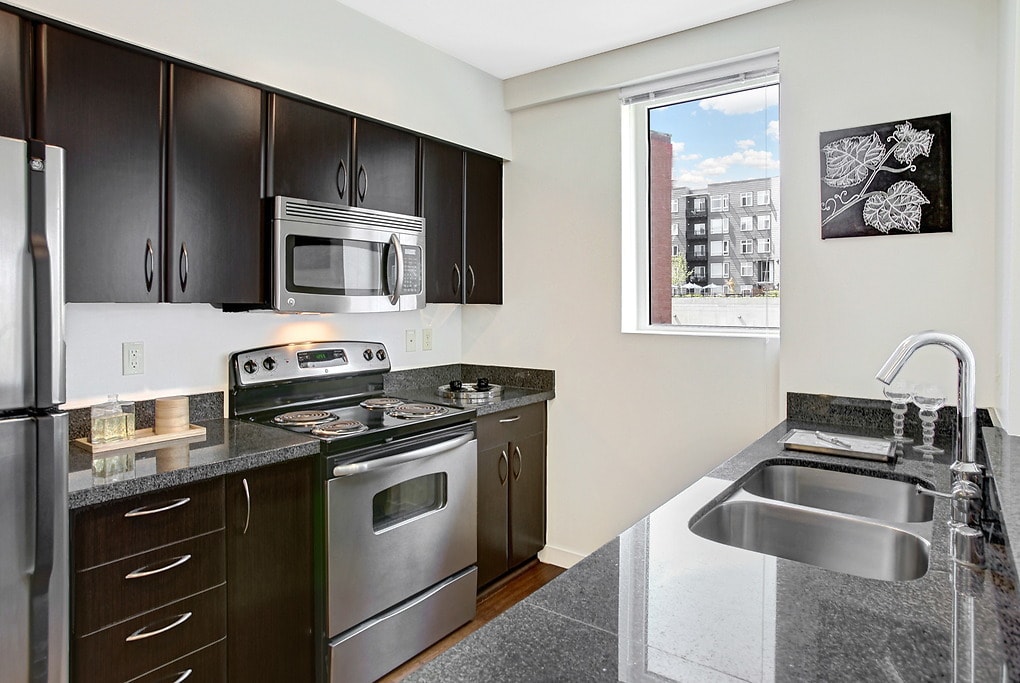 - Flat panel espresso cabinetry, Granite counte