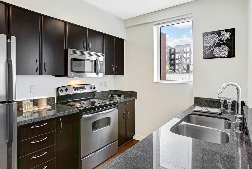 - Flat panel espresso cabinetry, Granite countertops, Polished chrome faucets, Stainless steel applian