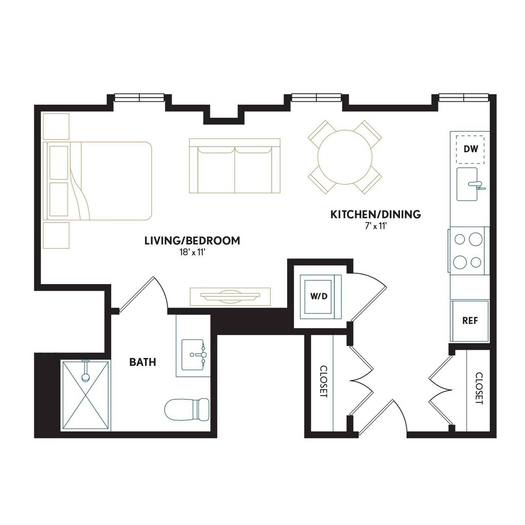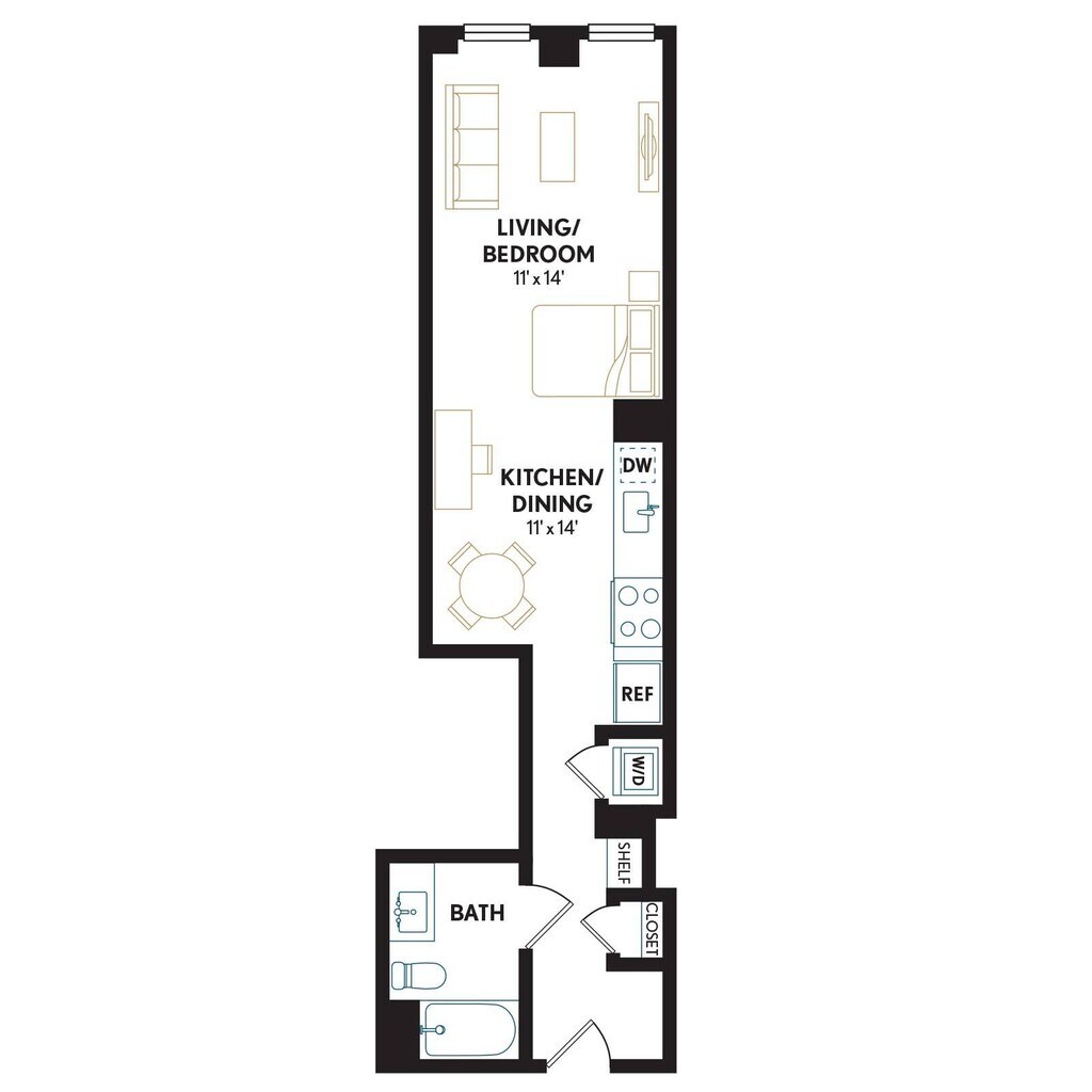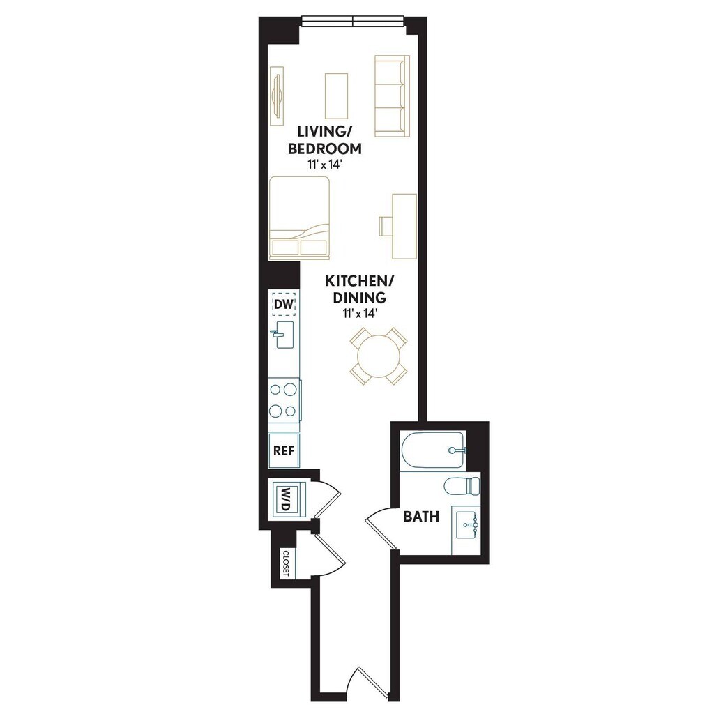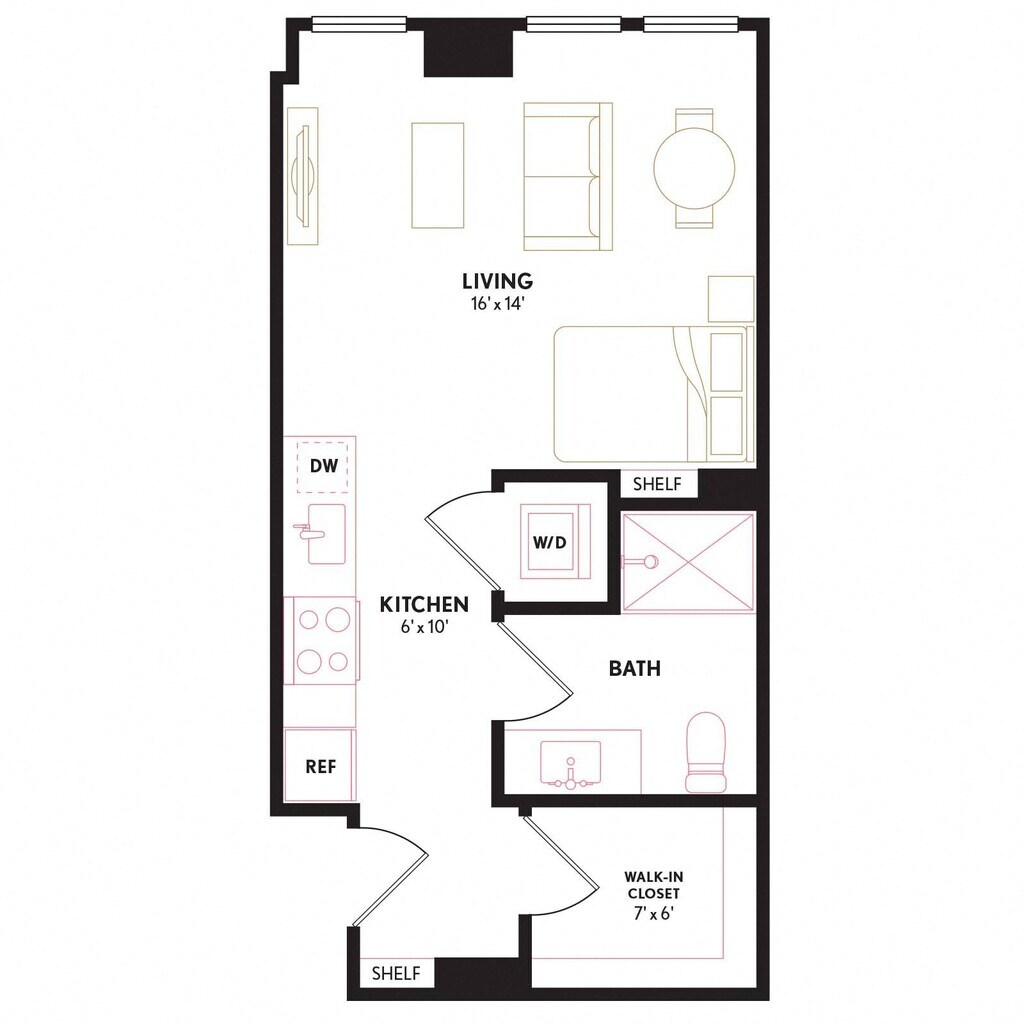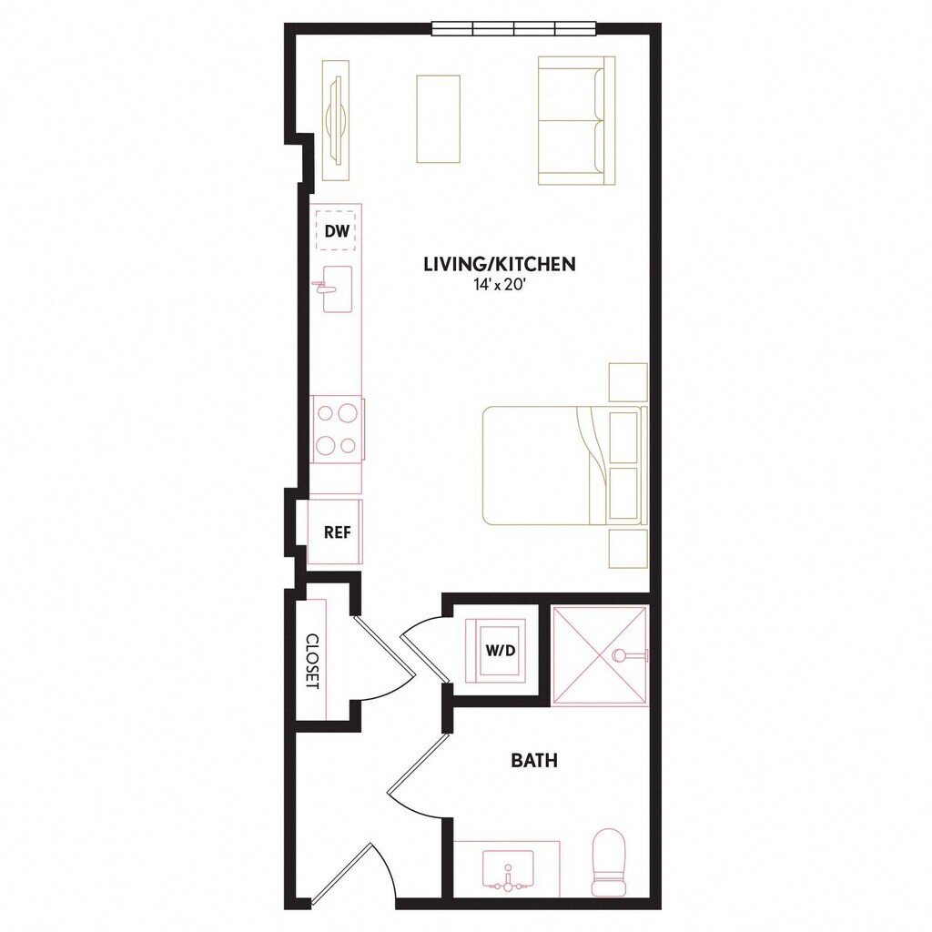 S14 - Floorplan 1 Apartment Unit: 0173Apartment Model: S14$2,207Studio, 1 Bath, 419 sq ftAvailable NowFloorplan S1