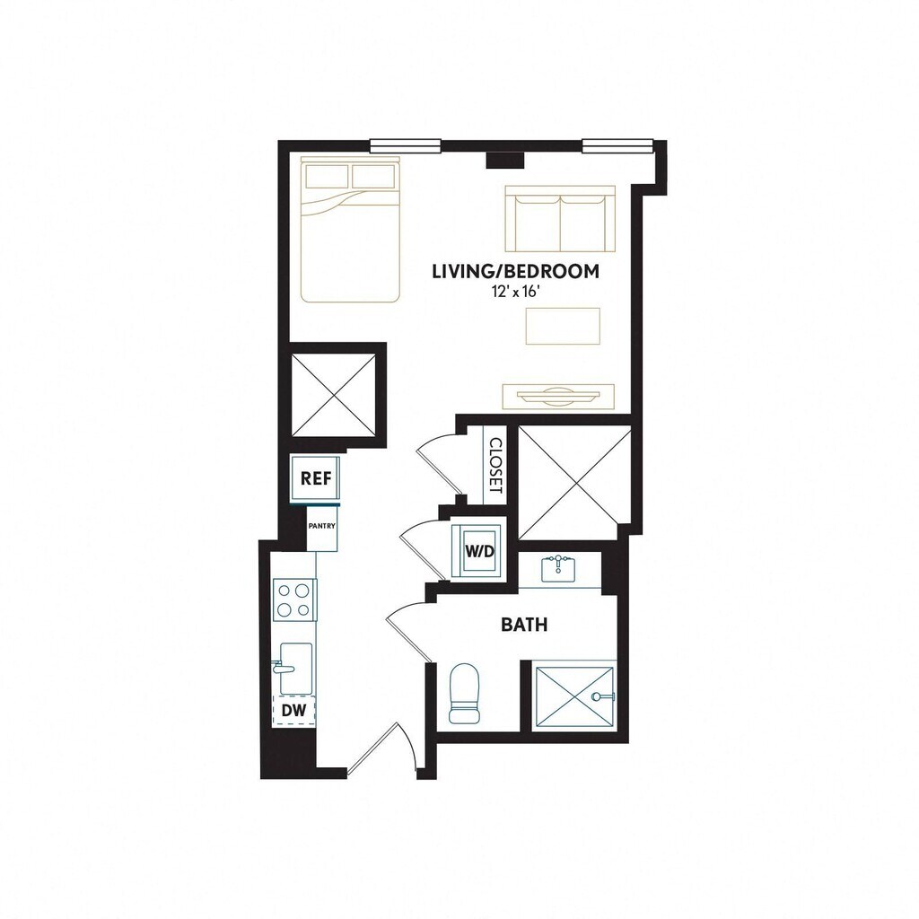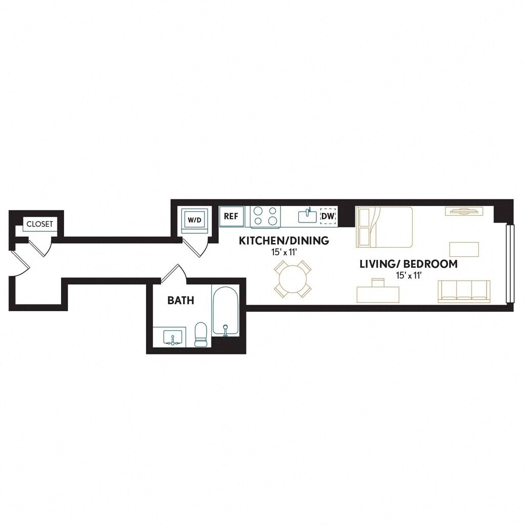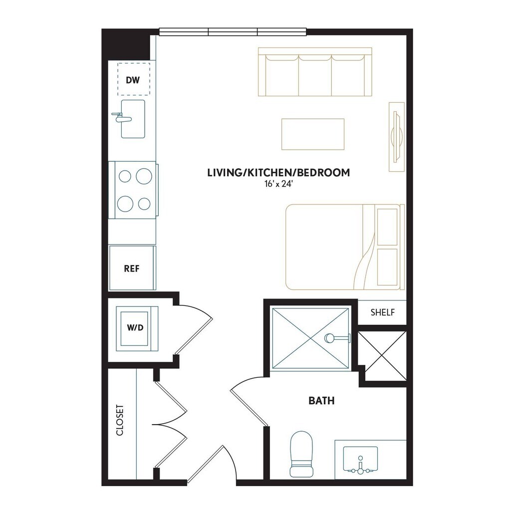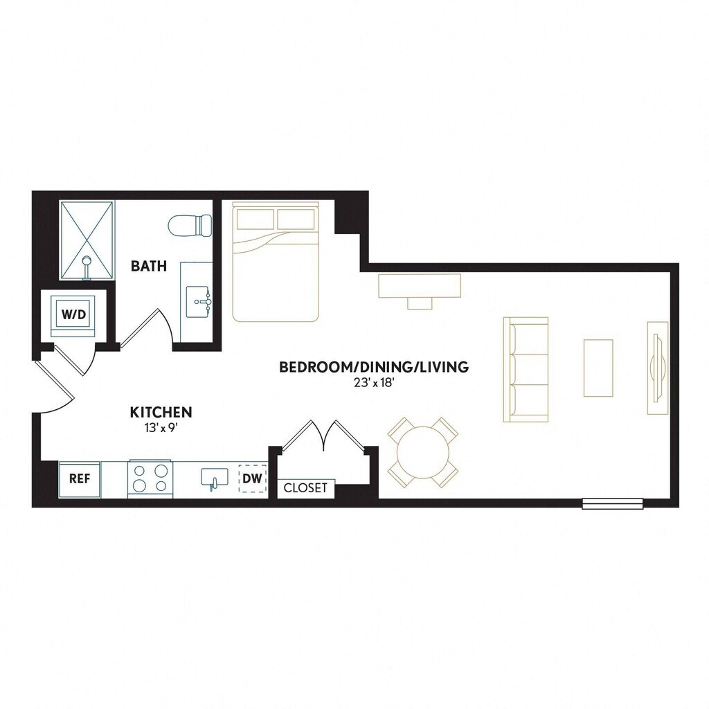 Apartment Model: S1From $2,342Studio, 1 Bath, 416 sq ftAvailable NowFloor plans are artist's rendering. All dimensions are approximate. Actual product and specifications may vary in dimension or detail. Not all features are available in every rental home. Prices and availability are subject to change. Base rent is based on monthly frequency. Additional fees may apply, such as but not limited to package delivery, trash, water, amenities, etc. Deposits vary. Please see a representative for details.
