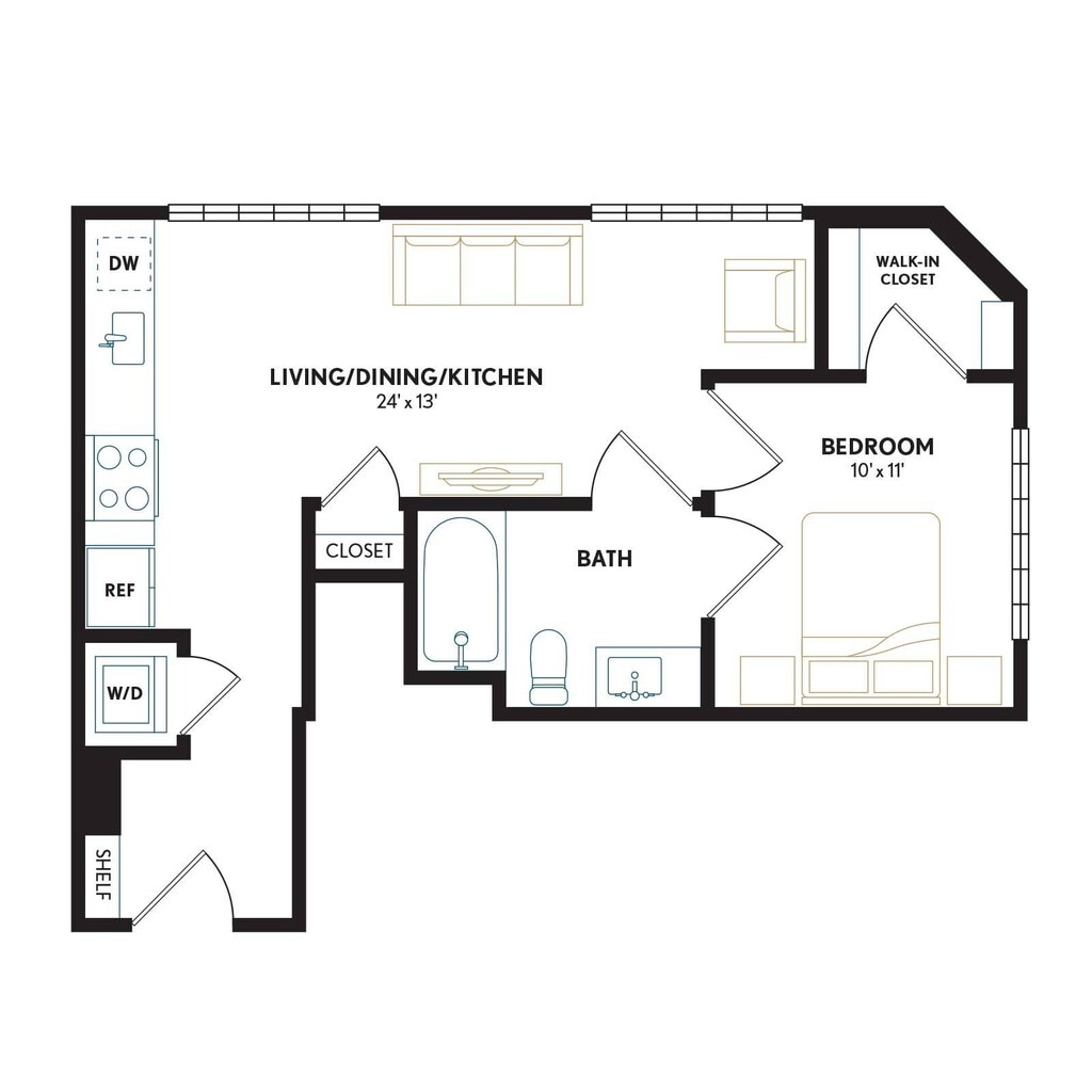 S10H - Floorplan 1 Apartment Unit: 0303Apartment Model: S10H$2,099Studio, 1 Bath, 407 sq ftAvailable NowFloorplan S1