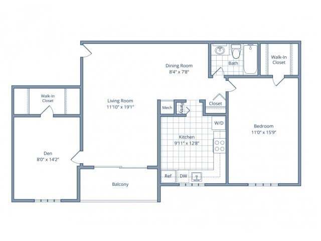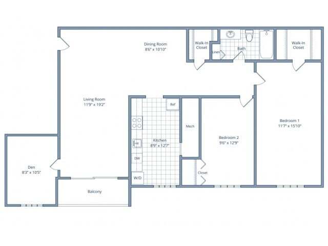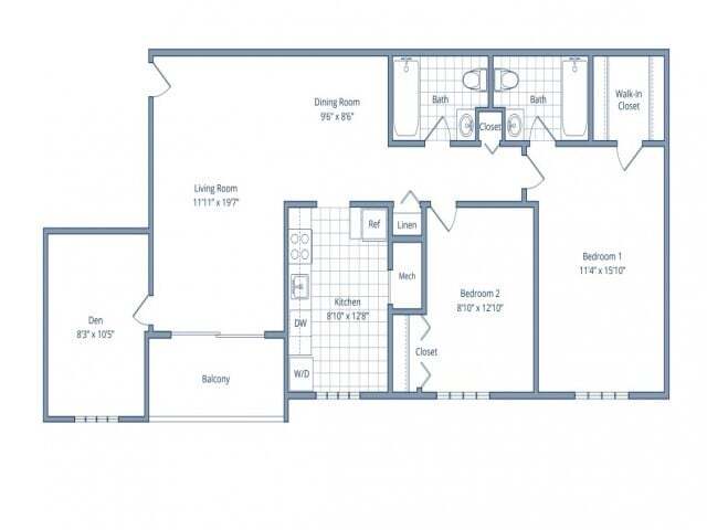 Apartment Model: 1 Bedroom/1 Bathroom w/ Den - 753 sq ftFrom $1,5921 Bedroom, 1 Bath, 753 sq ftAvailable November 21, 2025![]()