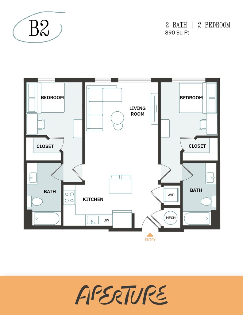Apartment Model: 2BR/2BA - B2From $1,3692 Bedroom, 2 Bath, 890 sq ftAvailable Now![]()