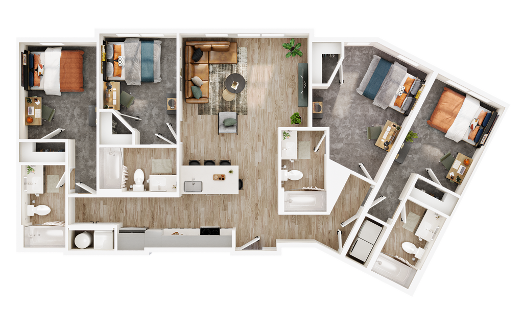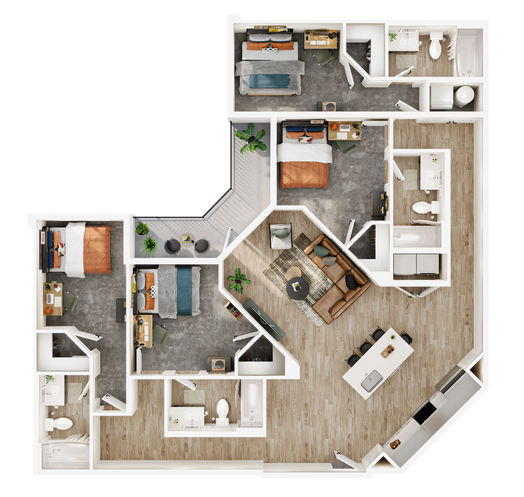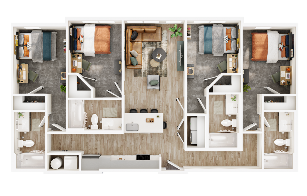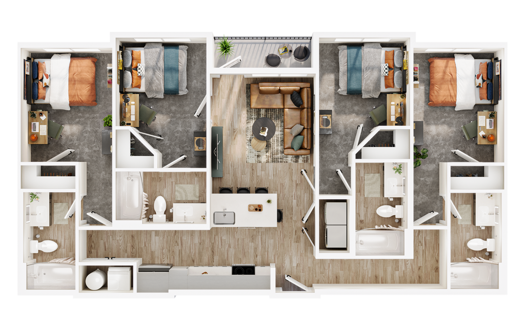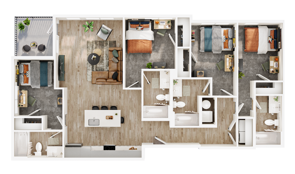 2BR/2BA - B3 - Floorplan 2 Apartment Unit: PrivateApartment Model: 2BR/2BA - B3$1,3692 Bedroom, 2 Bath, 893 sq ftAvailable August 13, 2026Apartment Unit: Top FloorApartment Model: 2BR/2BA - B3$1,3942 Bedroom, 2 Bath, 893 sq ftAvailable August 13, 20264 Bedrooms