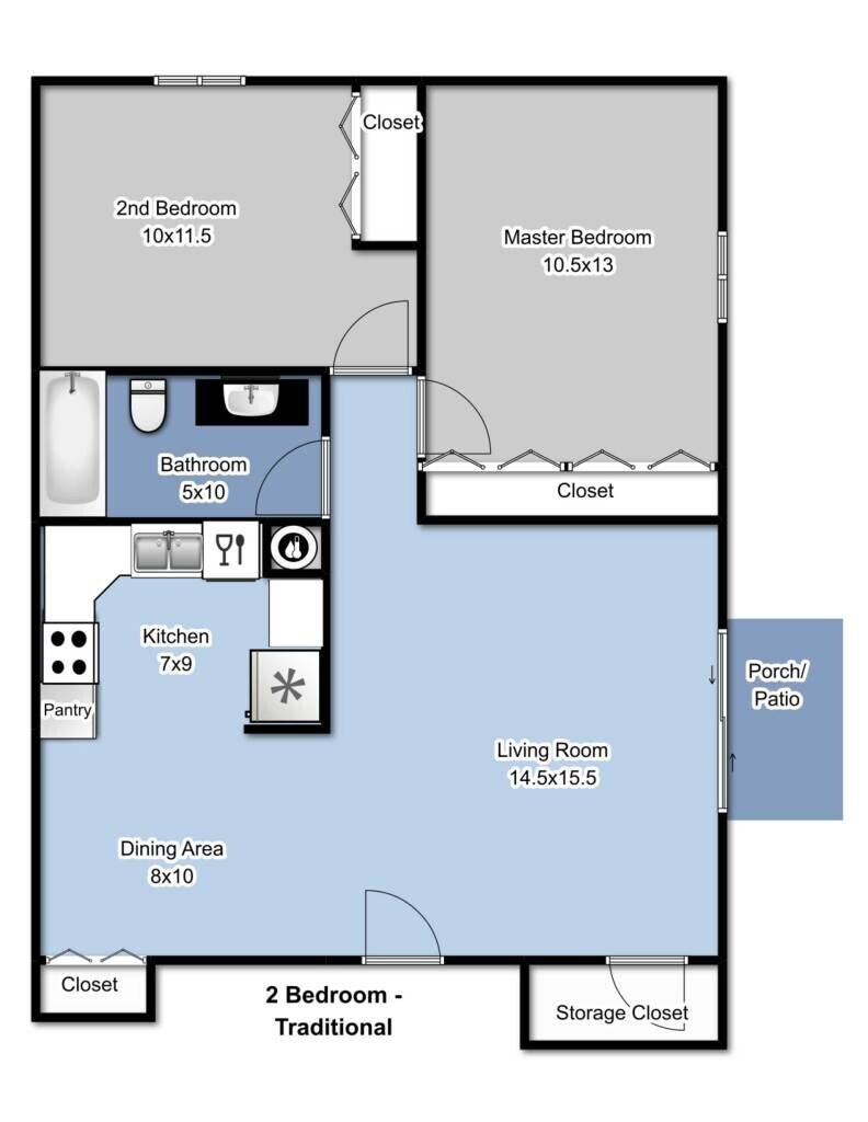 2 Bedroom (Traditional) - Floorplan 1 Apartment Unit: Soonest AvailableApartment Model: 2 Bedroom (Traditional)$1,0602 Bedroom, 1 Bath, 900 sq ftAvailable Now2 Bedroom Townhouse