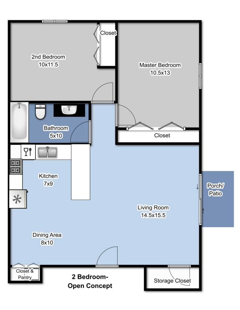 2 Bedroom (Open Concept) - Floorplan 1 Apartment Unit: Soonest AvailableApartment Model: 2 Bedroom (Open Concept)$1,0602 Bedroom, 1 Bath, 900 sq ftAvailable Now2 Bedroom (Traditional)