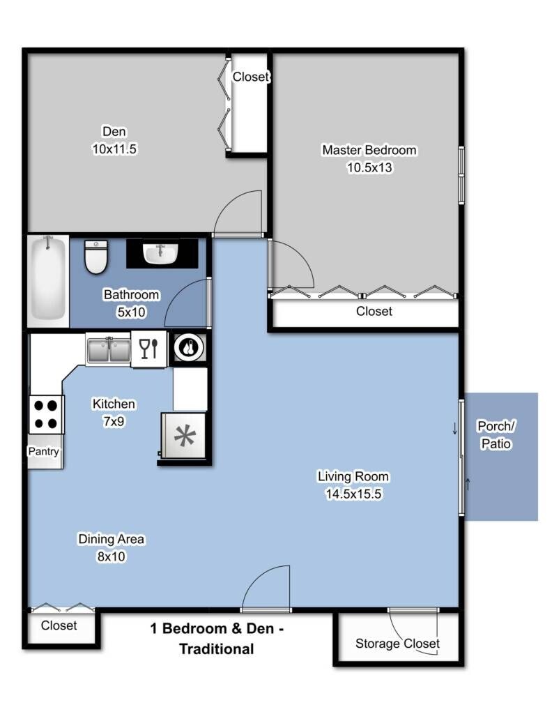 1 Bedroom and Den (Traditional) - Floorplan 1 Apartment Unit: Soonest AvailableApartment Model: 1 Bedroom and Den (Traditional)$9751 Bedroom, 1 Bath, 900 sq ftAvailable December 19, 20251 Bedroom