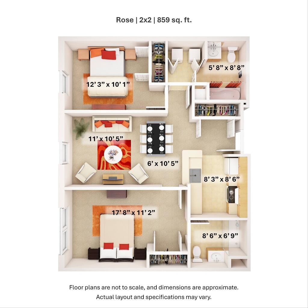 ROSE - Floorplan 2 Apartment Unit: 801-241Apartment Model: ROSE$1,8112 Bedroom, 2 Bath, 859 sq ftAvailable February 22, 2026ORCHID