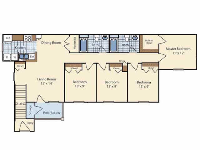 4BR Downstairs - Floorplan 1 Apartment Unit: D03Apartment Model: 4BR Downstairs4 Bedroom, 2 Bath, 1366 sq ftAvailable October 30, 20254BR Upstairs