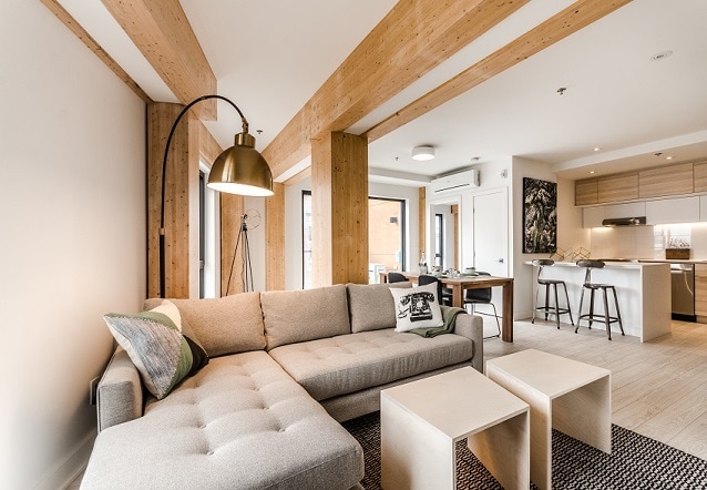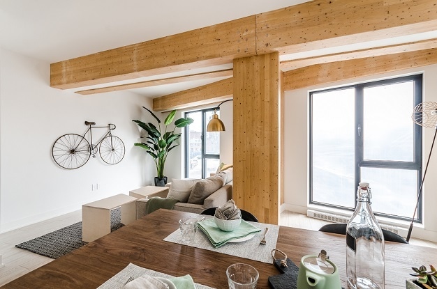 Built by a team of locally-based developers, architects and designers, Arbora showcases state-of-the-art construction, sustainable materials and outstanding design, creating an exceptional look and a superior quality living environment. Arbora was designed and developed by renowned Québec-based architecture firms LSR GesDev & Sotramont reflecting the latest urban development concepts featuring high-quality materials, exposed wooden beams and posts, ample windows providing an abundance of natural light, 9-foot ceilings and an on-site green space. Arbora is Certified LEED® Platinum and is one of the first buildings in Québec to be built with eco-friendly solid wood frame of cross-laminated timber (CLT) panels from the boreal forests of northern Quebec , a proven technology known for its strength and performance in terms of energy efficiency and acoustics.