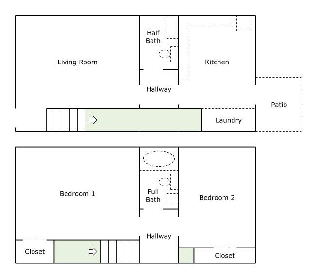 Apartment Model: 2 Bed/1.5 Bath TH - DeluxeFrom $1,1502 Bedroom, 1.5 Bath, 1020 sq ftAvailable NowFloorplansPhotos![]()