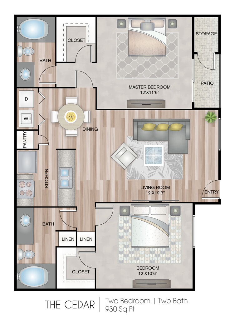 Apartment Model: The Oak with Washer & DryerFrom $2,1202 Bedroom, 2 Bath, 970 sq ftAvailable Now![]()