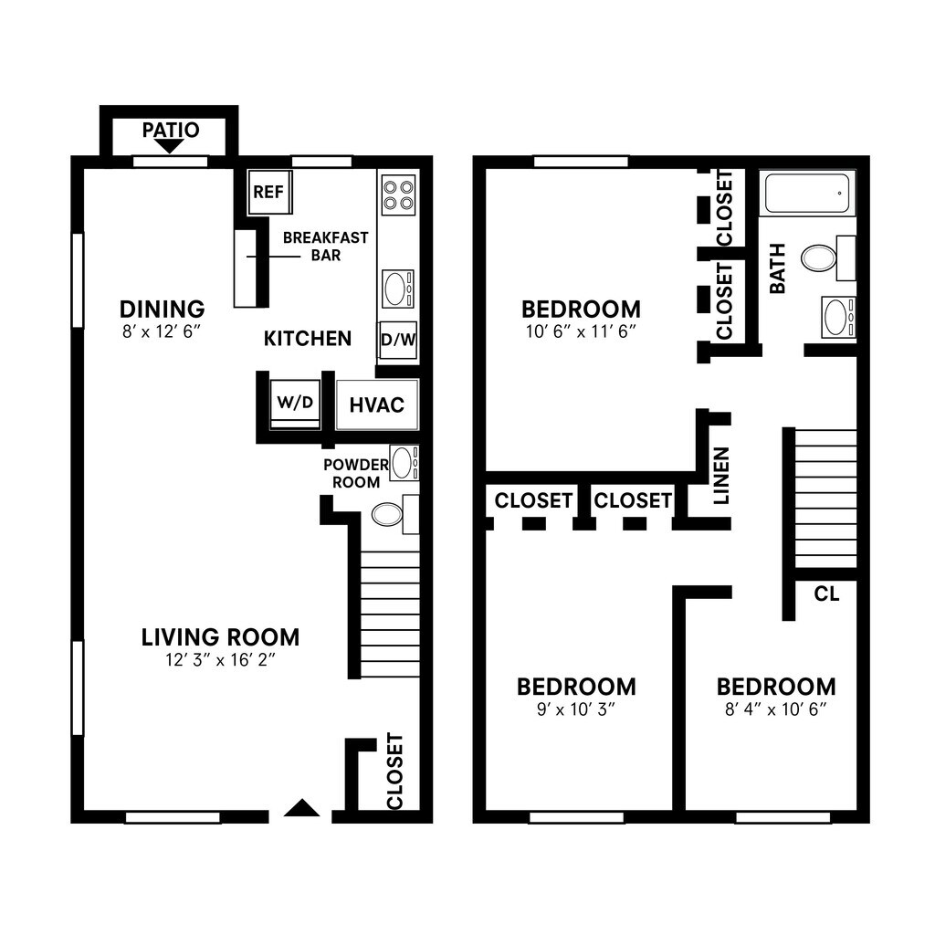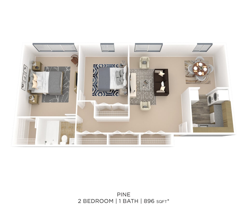 Apartment Model: Two Bedroom - 896 sqftFrom $1,3602 Bedroom, 1 Bath, 896 sq ftAvailable Now![]()