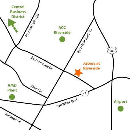 Meet a new place to live at Arbors at Riverside. With a location on E Riverside Dr in Austin's Montopolis neighborhood, you can easily connect with a number of points of interest within a few miles. The professional leasing team is ready to help you find the perfect fit. Contact us or drop by the leasing office to check the availability and schedule a tour today and find your new home at Arbors at Riverside.