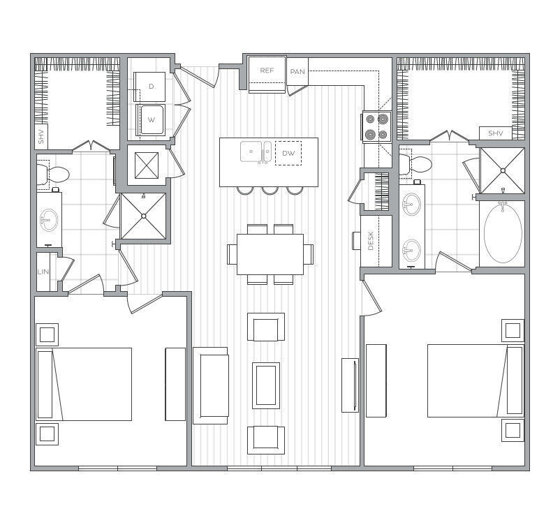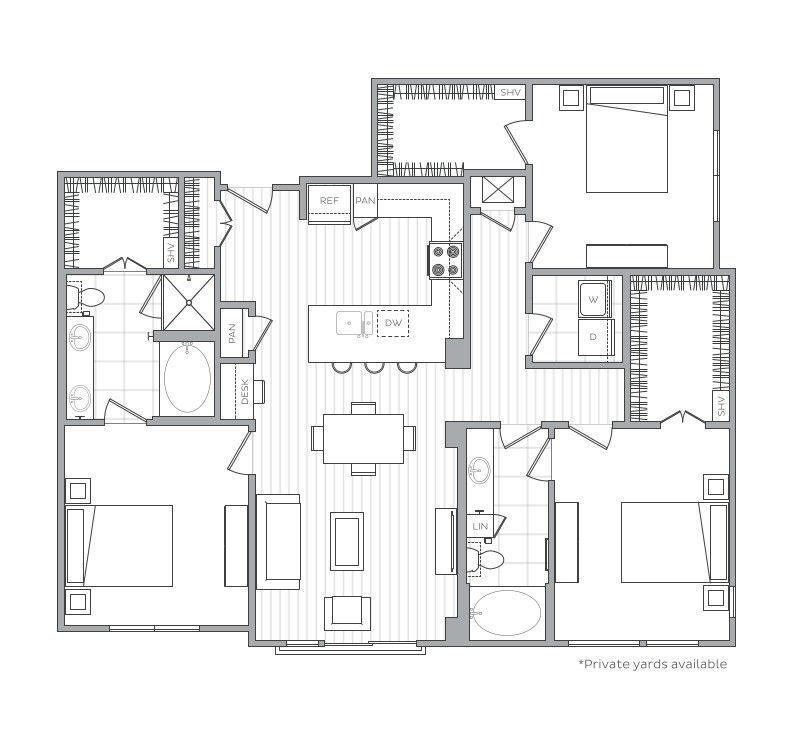 - Dual-vanity countertops, walk-in showers and linen closets*