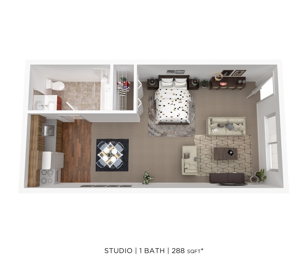 Studio, 1 Bath, 288 sq ftAvailable NowModel Gallery