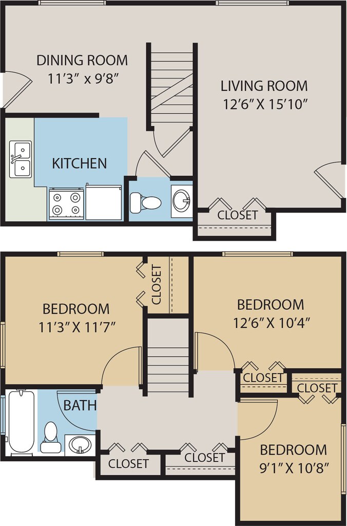 Apartment Model: 3 Bedroom 1.5 Bath Townhome$1,5503 Bedroom, 1.5 Bath, 1100-1200 sq ftAvailable Now![]()