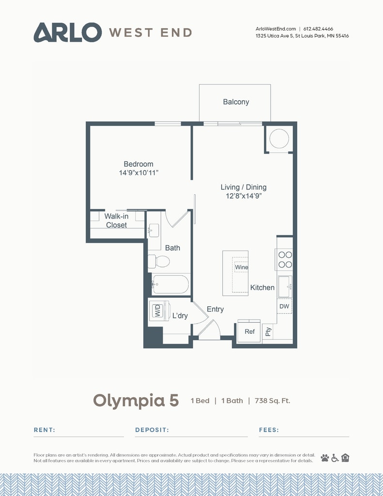 1 Bed, 1 Bath, 738 sq ftPlus FeesAvailable Mar 24Model Gallery