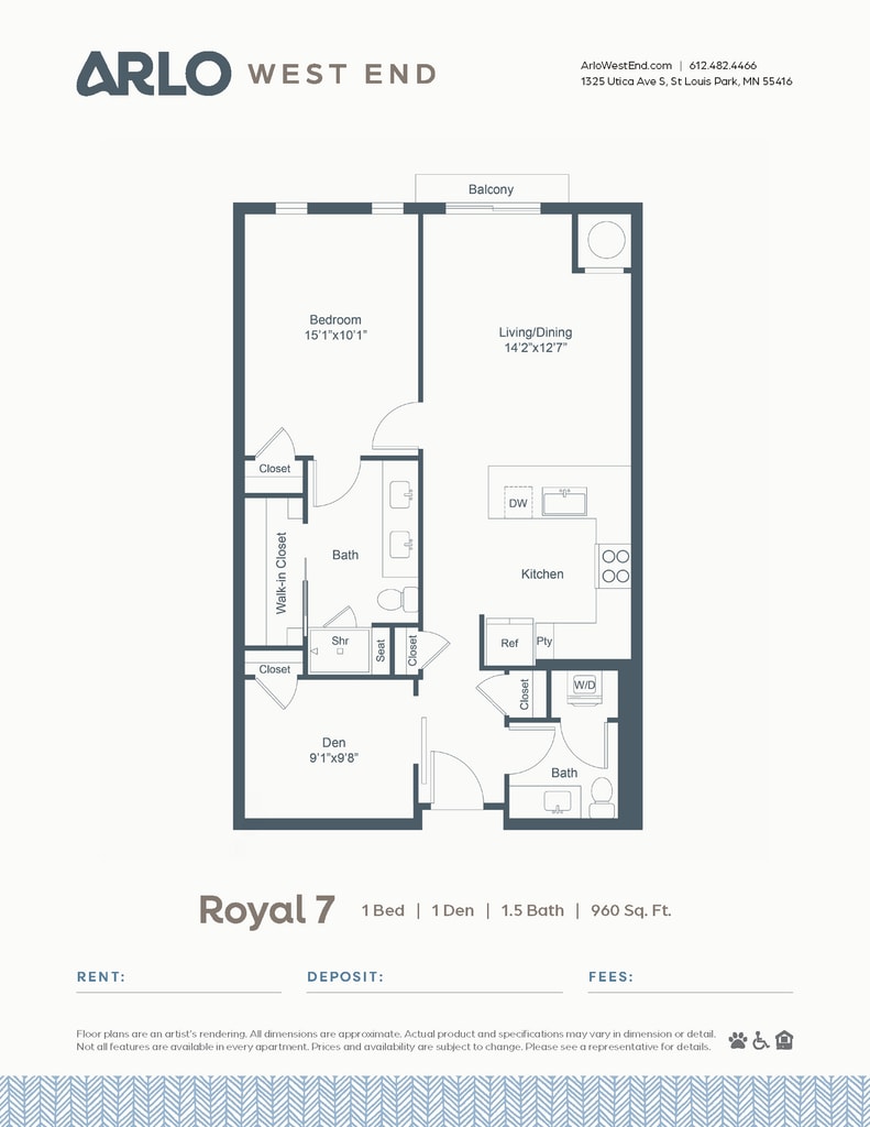 1 Bed, 1.5 Baths, 960 sq ftPlus FeesAvailable Apr 11Largest 1 BedroomThis is the largest 1 Bedroom at this PropertyModel Gallery