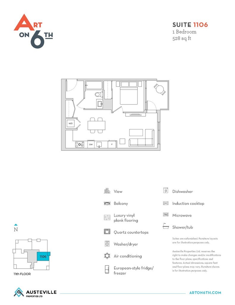 AN ORIGINAL WORK OF ART Art on 6th is a completely new and modern pet-free apartment building, purpose-built for discerning renters seeking superb design, inspiring views and a prime Vancouver west side location. The 12-storey mid-rise building, straddled between South Granville and Kitsilano, is home to 97 one-bedroom, one-bedroom + den, and two-bedroom apartments. There are also three levels of underground parking. Art on 6th amenities include a fitness centre boasting up-to-the-minute equipment, a furnished guest suite with WIFI, as well as smart conveniences like electric car docking stations and a carwash bay. Security features include a keyless entry system, secure bicycle storage room, video cameras in public areas, panic stations in the three-level parkade and onsite, full-time building managers.