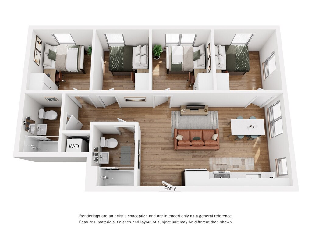 Apartment Model: D1From $1,8754 Bedroom, 2 Bath, 850 sq ftAvailable June 1, 2026Floor plans are artist's rendering. All dimensions are approximate. Actual product and specifications may vary in dimension or detail. Not all features are available in every rental home. Please see a representative for details.