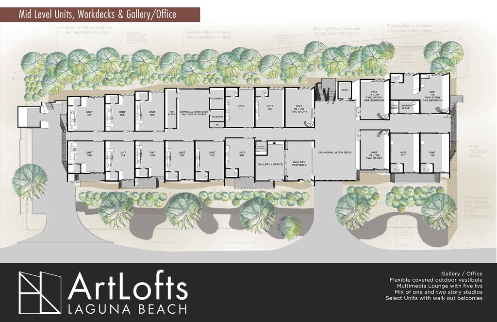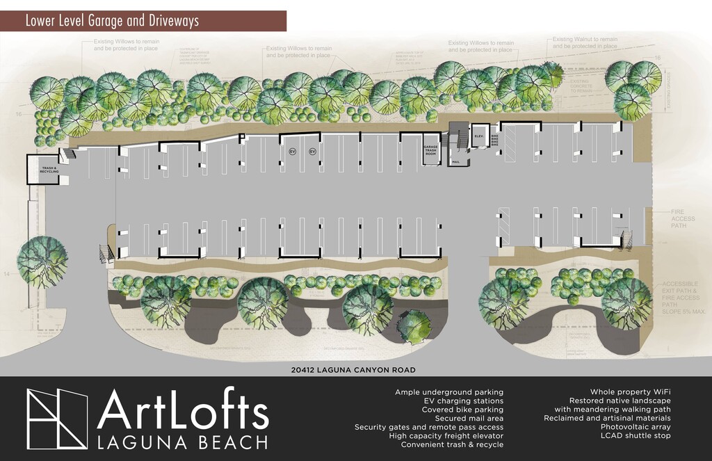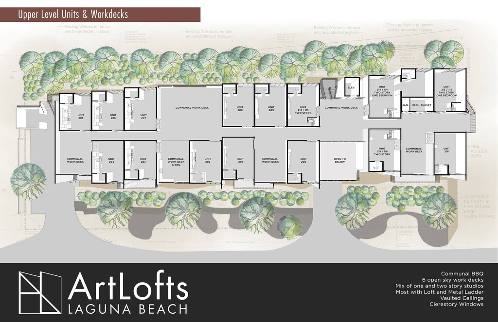 ArtLofts is a purpose-built work/live development created by artists for artists. One resident per household is required to be a working artist or a student who is also a working artist and must be approved by the City of Laguna Beach Arts Commission and receive an Artists Occupancy Permit. All individuals whose primary occupation includes one of the following qualify: Visual (painting, drawing, sculpture, book arts, printmaking & mixed media), Imaginative (literature, poetry, photography, music composition, choreography, cinematography & computer arts), Functional (metal, textiles, paper, wood, ceramics, glass, and/or plastic objects), Performing (singers, dancers, musicians, actors, performance artists; costume, lighting, sound & set designers) Combine multiple rents into a dual-purpose art studio and living space with collaborative work decks joined by open air breezeways and anchored by a commercial exhibition/sales gallery and multi-media digital lounge. Ideal for individual established or burgeoning artists on their own, with roommates or families. These 28 single and two-story industrial studios offer flexible space for working and living with concrete floors and open beam ceilings swathed in a lustrous white finish enhanced with high-end materials in the kitchen and bath. Designed to be in tune with the canyon setting the signature saw tooth south pitched roofs support the solar array and create dynamic vaulted ceilings to foster creativity and comfort with natural ambient lighting from the large clerestory windows. Finished with high end European flat front cabinets covered in a fingerprint less matte black exterior with soft close hinges and drawer glides topped with a suede Silestone Et Noir Counter and backsplash. Boasting A luxury kitchen and bath fixture package from Pfister and appliances from GE include an electric range with oven, recirculating microwave, refrigerator/freezer, dish washer and the convenience of vented in unit laundry. Enjoy scenic canyon views and abundant light and fresh air from the three-pane sliding door with Juliette balcony. For the Goldilocks in us all the units feature a ceiling fan as well as central heat and ac to keep the temperature just right. ArtLofts provides ample parking for residents and visitors as well as access to public transportation and the LCAD shuttle for all students. The property is nestled in the heart of Laguna Canyon, just 3 miles from the beach, 2.5 miles from downtown, 1.5 miles from Laguna’s famous festivals, 1 mile from the Laguna College of Art & Design, and surrounded by 20,000 acres of conservation land. Just off the property is over 45 miles of hiking and biking trails that have the most beautiful vistas of California coastline and canyons. Just 5.7 miles to the 405 and less than 12 miles from John Wayne Airport. Come experience one destination that perfectly blends the best of art, entertainment, and nature at a one-of-a-kind new build development.