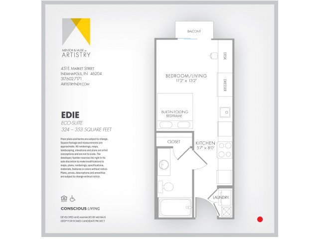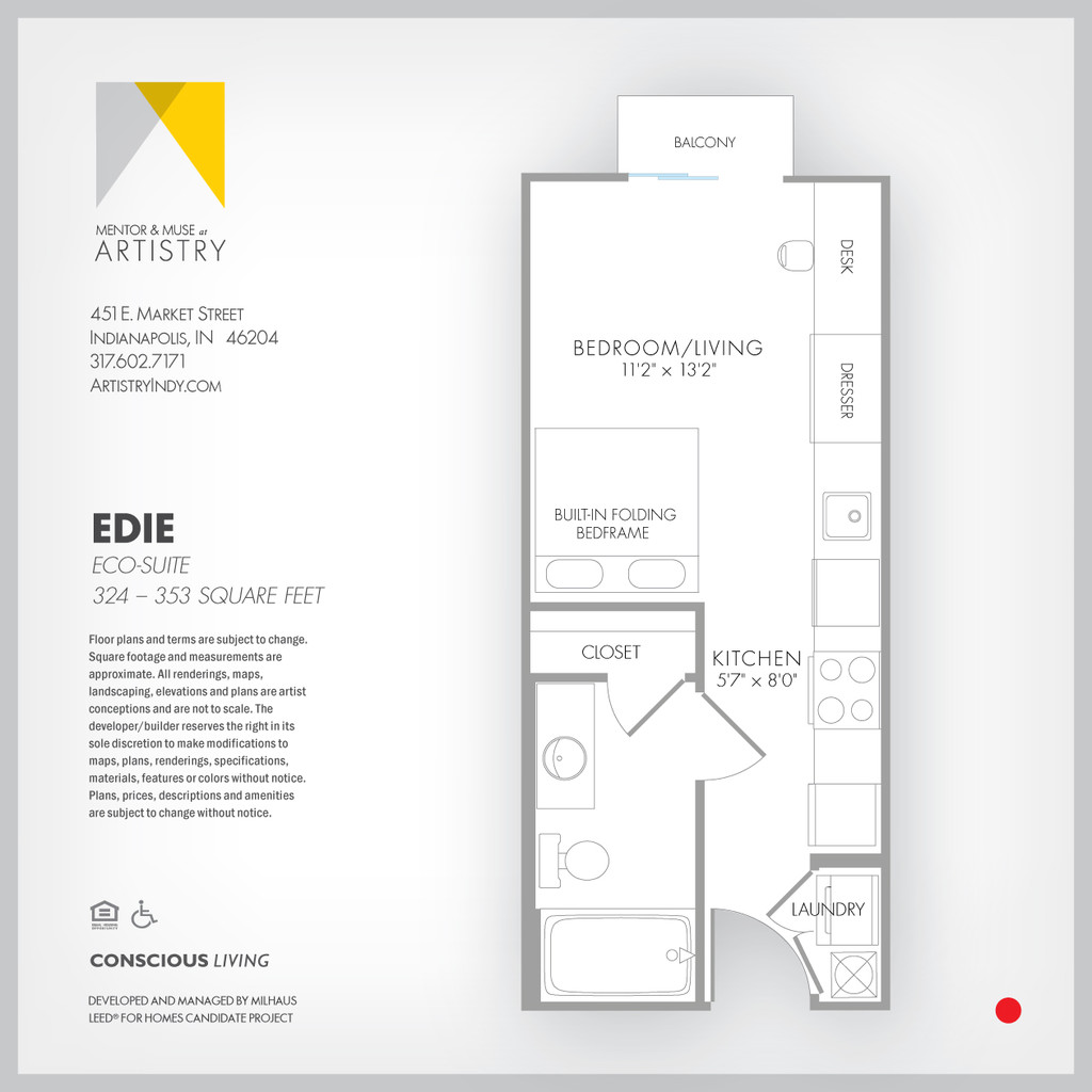 Edie (EcoSuite) - Floorplan 2 Apartment Unit: Mentor-338Apartment Model: Edie (EcoSuite)From $978Studio, 1 Bath, 324 sq ftAvailable SoonApartment Unit: Mentor-525Apartment Model: Edie (EcoSuite)From $1,128Studio, 1 Bath, 353 sq ftAvailable December 19, 2025Apartment Unit: Muse-302Apartment Model: Edie (EcoSuite)From $928Studio, 1 Bath, 324 sq ftAvailable February 5, 2026Floorplan Lee