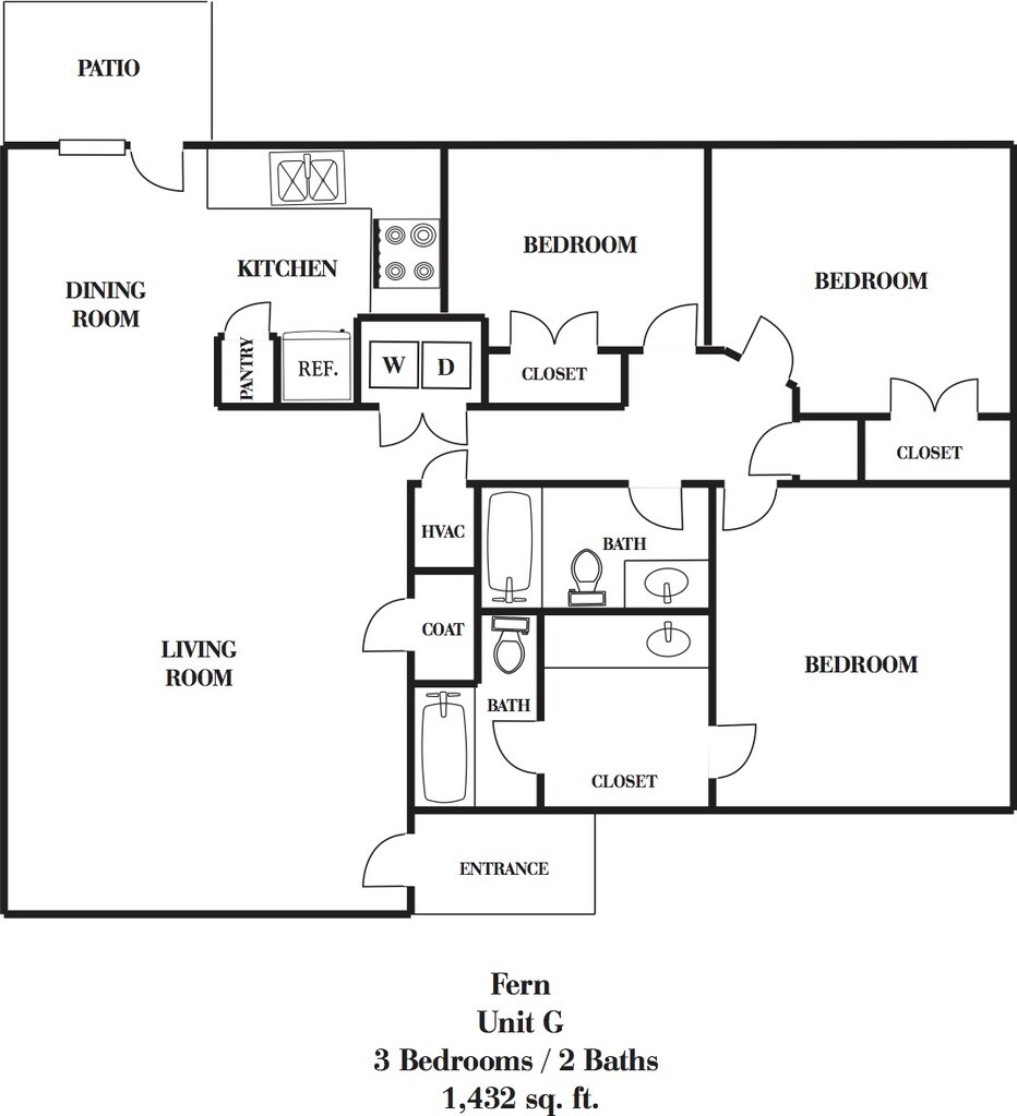 Apartment Model: Fern$1,5703 Bedroom, 2 Bath, 1432 sq ftAvailable NowFern - Floorplan 1 Hickory