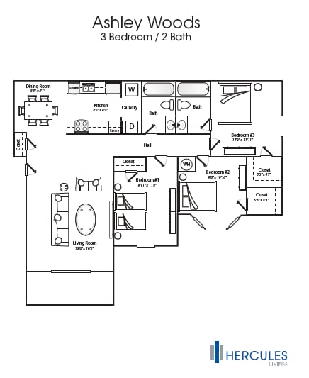 Apartment Model: TWO BEDROOM$1,4102 Bedroom, 2 Bath, 1010 sq ftAvailable NowTWO BEDROOM - Floorplan 1 3 Bedrooms