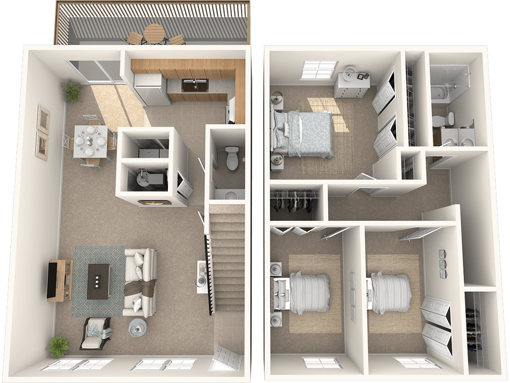 - 3 Bedrooms- 3 Bedroom Townhome- From $1,6023 Beds, 1.5 Baths, 1119 sq ftAvailable Now- Model Gallery- Floorplans- Availability Details- Price - Availability Date - Unit - Sq Ft - $1,602 - Available Now - 00105 - 1119 - $1,616 - Available Now - 00406 - 1119 - $1,602 - Available Now - 01807 - 1119 - Model Amenities and Features- Features- Air Conditioning