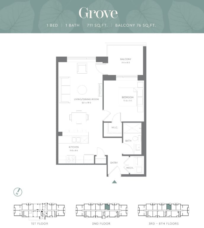 Grove - Floorplan Apartment Unit: 310Apartment Model: Grove$2,1251 Bedroom, 1 Bath, 711 sq ftAvailable NowApartment Unit: 810Apartment Model: Grove$2,1751 Bedroom, 1 Bath, 711 sq ftAvailable NowSlate