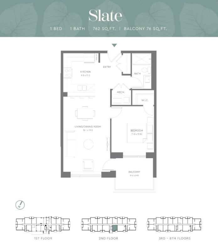Slate - Floorplan Apartment Unit: 216Apartment Model: Slate$2,1501 Bedroom, 1 Bath, 762 sq ftAvailable NowMeadow