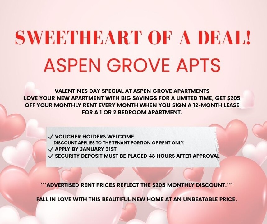 St PATRICKS DAY SPECIAL AT ASPEN GROVE APARTMENTS SAVE SOME GREEN WITH BIG SAVINGS For a limited time, get $205 OFF your monthly rent EVERY MONTH when you sign a 12-month lease for a 1 or 2 bedroom apartment. ? Voucher holders welcome — discount applies to the tenant portion of rent only. ? Apply within 24 hours of showing ? Security deposit must be placed 48 hours after approval ***Advertised rent prices reflect the $205 monthly discount.*** Save some green with this beautiful new home at an unbeatable price. Aspen Grove Apartments — Your New Beginning Starts Here. Find space, comfort, and value at Aspen Grove Apartments, where our 2-bedroom affordable homes are designed to fit your lifestyle with convenience and quality. Apartment Features: Spacious floor plan with two comfortable bedrooms Bright open-concept living and dining area Modern kitchen with energy-efficient appliances Ample storage and closet space Private bathroom with updated fixtures Air conditioning and heating for year-round comfort Community Amenities: On-site laundry facilities Ample off-street parking 24-hour emergency maintenance Professional, responsive management team Convenient location near shopping, dining, schools, and public transportation Affordability & Accessibility: Aspen Grove participates in an affordable housing program, offering rent that is income-restricted to help keep housing within reach. We welcome all qualified applicants in accordance with Fair Housing laws.