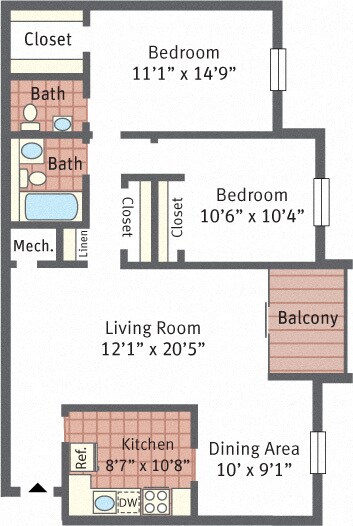 Apartment Model: Two Bedroom + BalconyFrom $1,3002 Bedroom, 1.5 Bath, 1008-1023 sq ftAvailable Now![]()